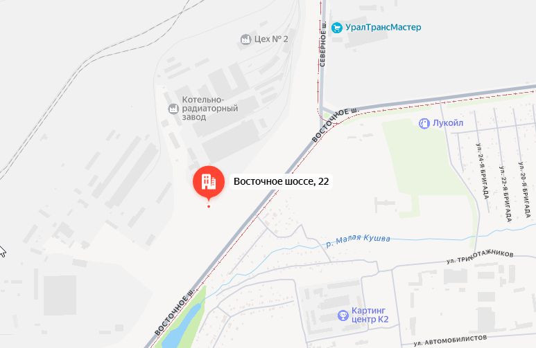 Вбивайте «Восточное шоссе, 22/1» или координаты 57.916890, 60.052215 — маршрут приведёт к промзоне на Восточном шоссе. Дальше следуйте указателям на грузовую зону и КПП.