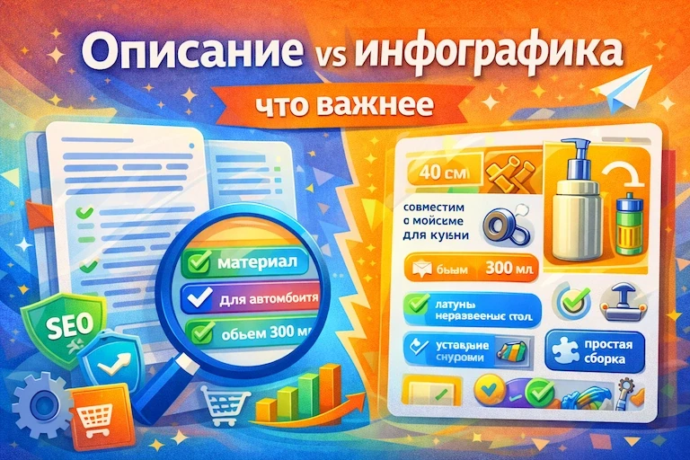 Сравниваем описание и инфографику в карточке товара: что сильнее влияет на ранжирование, конверсию и возвраты. Схемы, примеры, чек-лист.
