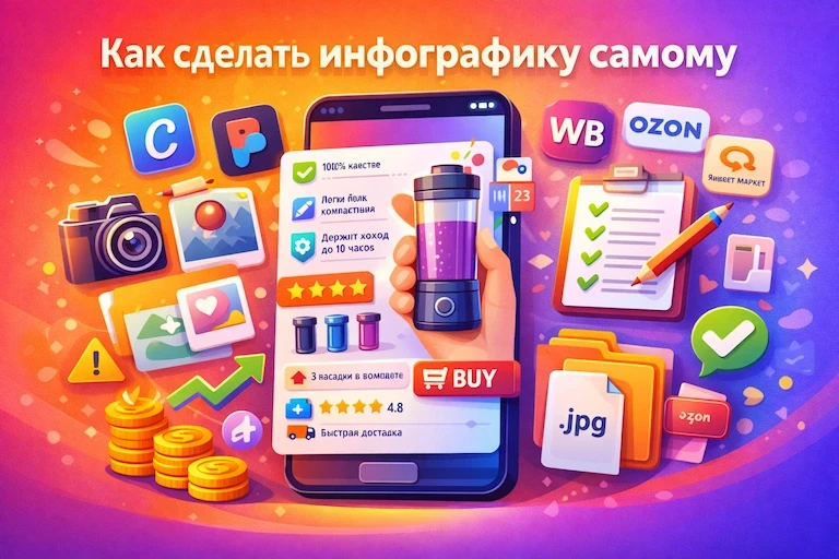Пошаговый план, как сделать инфографику для карточки товара самому: смыслы, фото, форматы WB, Ozon, Яндекс Маркет, проверка и экспорт.