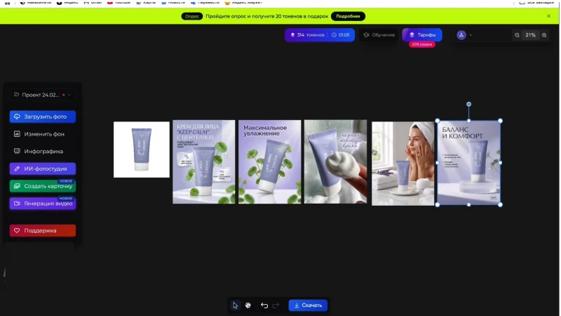 НейроКард — это не просто сервис, который делает ИИ фото для маркетплейсов . Его реальная ценность в другом: он помогает за одну генерацию получить сразу несколько слайдов и быстро превратить их в логичную серию для карточки товара.